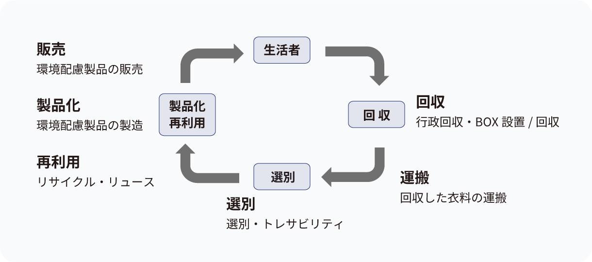 使用済衣類の安定回収、リユース、リサイクルを通じて廃棄量削減を実現し、